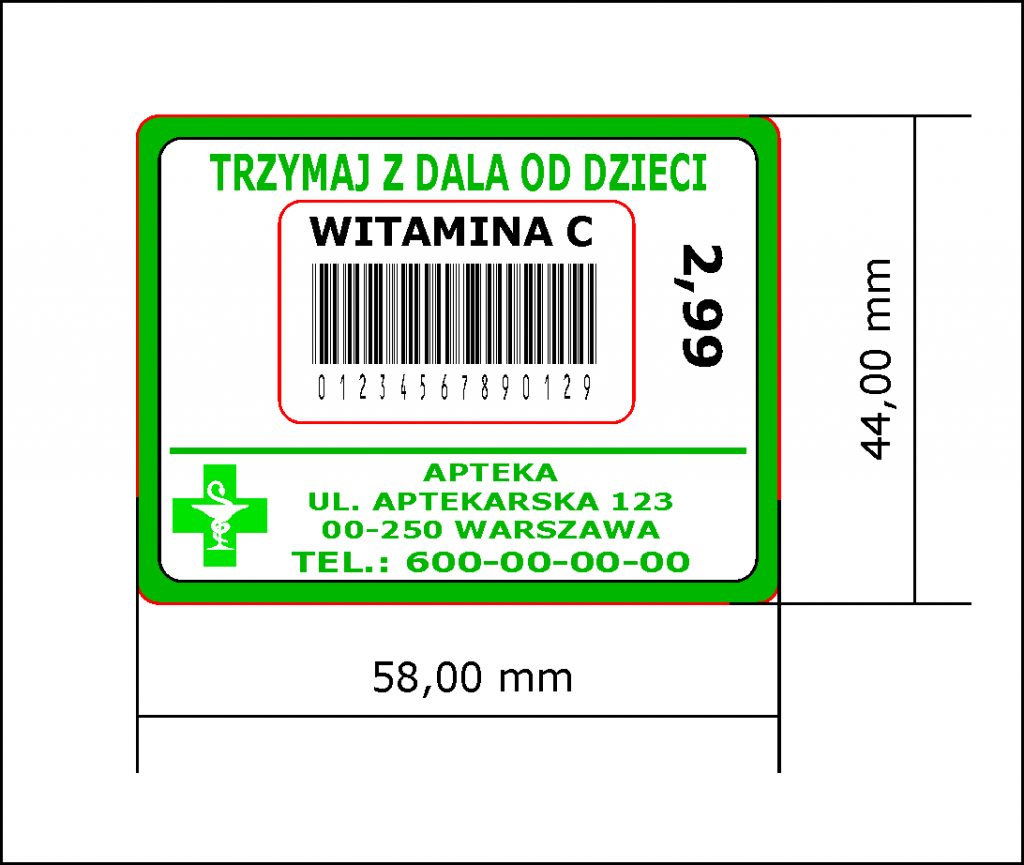 Etykiety samoprzylepne 58×44 z nadrukiem 1 kolor dla Aptek 10.000 szt.